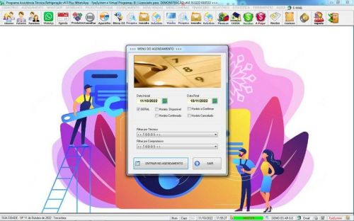 Sistema ordem de serviço de refrigeração com Vendas Financeiro e Mensagem v6.0 + WhatsApp Ordem de Serviço / Orçamento / Clientes / Foto dos Clientes / Fornecedores / Técnicos / Relatório de OS / Personalizar Fundo de Tela / Logomarca / Pedido de Vendas / Pedido de Compras / Controle de Estoque / Financeiro Completo / 2 Fotos nos produtos / Relatório de Vendas / Relatórios Estatísticos / Reajuste de Preços em Bloco / Cadastro de Equipamentos com Fotos / Acesso por nível de usuário / Gera E-mail / Enviar Mensagem via WhatsApp