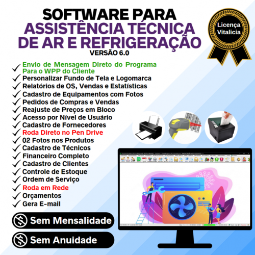 Software ordem de serviço de refrigeração com Vendas Financeiro e Mensagem v6.0 + WhatsApp Ordem de Serviço / Orçamento / Clientes / Foto dos Clientes / Fornecedores / Técnicos / Relatório de OS / Personalizar Fundo de Tela / Logomarca / Pedido de Vendas / Pedido de Compras / Controle de Estoque / Financeiro Completo / 2 Fotos nos produtos / Relatório de Vendas / Relatórios Estatísticos / Reajuste de Preços em Bloco / Cadastro de Equipamentos com Fotos / Acesso por nível de usuário / Gera E-mail / Enviar Mensagem via WhatsApp