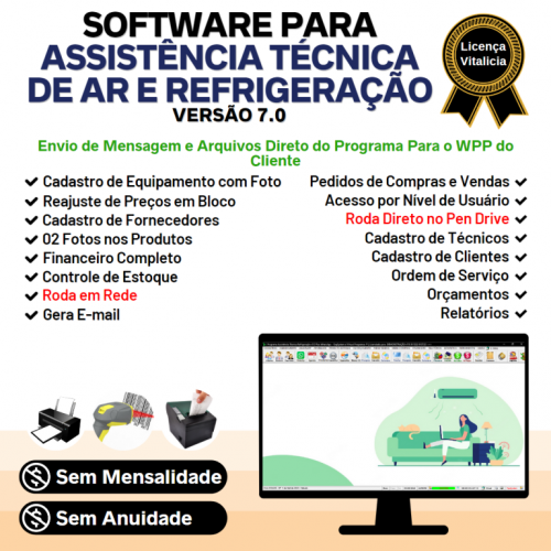 Software ordem de serviço de refrigeração com Vendas Financeiro e Mensagem v7.0 + WhatsApp Ordem de Serviço / Orçamento / Clientes / Foto dos Clientes / Fornecedores / Técnicos / Relatório de OS / Personalizar Fundo de Tela / Logomarca / Pedido de Vendas / Pedido de Compras / Controle de Estoque / Financeiro Completo / 2 Fotos nos produtos / Relatório de Vendas / Relatórios Estatísticos / Reajuste de Preços em Bloco / Cadastro de Equipamentos com Fotos / Acesso por nível de usuário / Gera E-mail / Enviar Mensagem e OS, Orçamentos e Vendas via WhatsApp