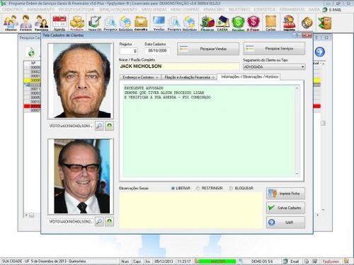 PRINCIPAIS CADASTRO E FUNÇÕES: Clientes com Fotos Fornecedores Vendedores Atendentes Ordem de Serviço Orçamento Venda Balcão Agendamento de Serviços Pedido de Compras Cadastro de Produtos com até 2 fotos Controle de Estoque Relação de Produtos Relatório dos Produtos para Reposição Relatório dos Produtos Mais Vendidos Relatório dos Clientes que mais compram Relatório dos Serviços mais Executados Reajuste de Preços em Bloco Impressão em Jato de tinta Impressão em Matricial 80colunas Impressão em Cupom Não Fiscal 40col Relatório dos aniversariantes Acesso por nível de usuário Controle Financeiro / Caixa Contas a Receber Contas a Pagar Plano de Contas Configurar logotipo Configurar Fundo de Tela