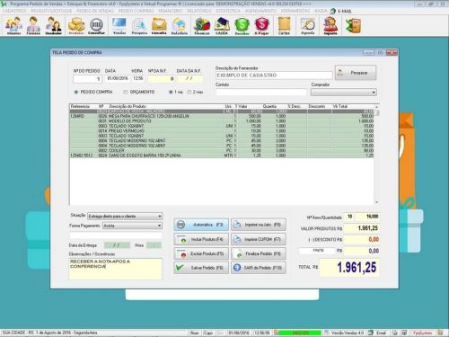 Geração de Pedidos: Permite aos usuários criar pedidos de vendas para clientes, controle de entregas, selecionando produtos, especificando quantidades, aplicando descontos, com impressão do pedido em A4 ou cupom não fiscal.