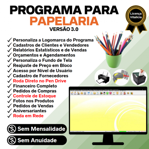 Principais vantagens: - Não tem Limite de Cadastro - Roda em todas as versões do Windows 32 e 64 Bits - Não precisa de internet - Roda direto no Pen Drive ou HD externo - Roda em Rede Compartilhando os Dados - Não tem mensalidade / Não tem anuidade - Suporte e Atendimento OnLine via site ou menu ajuda do programa - Backup do Programa - Personalizar o fundo de tela e logomarca
