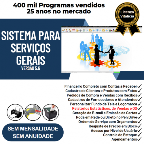 Sistema Os Serviços Gerais com Vendas Financeiro e Estatísticas v5.6 Plus Ordem de Serviço / Orçamento / Clientes / Foto dos Clientes / Fornecedores / Atendentes / Relatório de OS / Personalizar Fundo de Tela / Logomarca / Pedido de Vendas / Pedido de Compras / Controle de Estoque / Financeiro Completo / 2 Fotos nos produtos / Relatório de Vendas / Relatórios Estatísticos / Reajuste de Preços em Bloco / Acesso por nível de usuário / Gera E-mail / Recibo de Pagamento / Agendamento / Emissão de Cartas