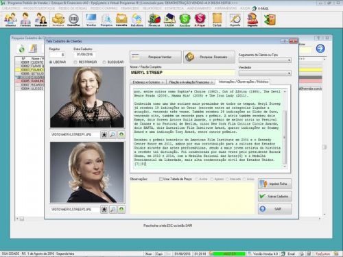 Gestão de Clientes: Armazena informações detalhadas sobre os clientes, como nome, foto, data nascimento, endereço, informações de contato, histórico de compras, Isso ajuda os vendedores a fornecer um serviço mais personalizado e a acompanhar o relacionamento com o cliente ao longo do tempo, com controle de limite de crédito.